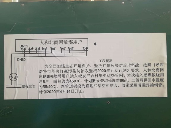 按照《呼和浩特市堅決打贏污染防治攻堅戰2020年行動計劃》總體要求,該項目接入燃煤散燒用戶42戶,面積約2450平方米,其中一家村豐州路西34戶,2000平方米;人和北商網8戶,450平方米該項目計劃敷設管線溝槽長度約174米,其中一家村豐州路西為88米,人和北商網為86米。新管道鋪設以直埋和架空相結合的方式,全部采用普通焊接鋼管,開工時間為2020414日。