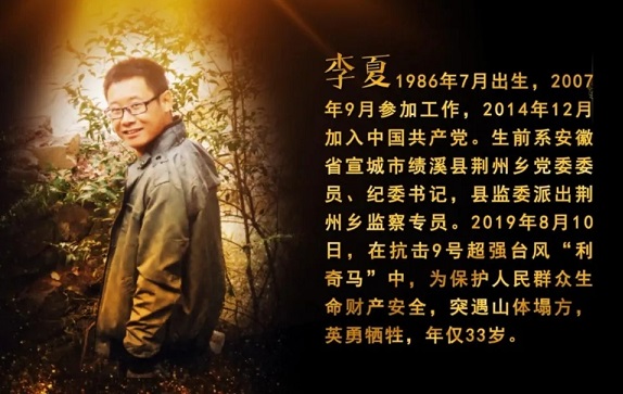 影片中,李夏同志生前是安徽省宣城市績溪縣荊州鄉黨委委員、紀委書記,縣監委派出荊州鄉監察專員。他堅定理想信念、堅守初心使命,十余年來,始終奮戰在脫貧攻堅、鄉村振興、正風肅紀第一線。他堅持原則、一身正氣,在紀檢監察工作崗位上,敢于較真碰硬,鐵面執紀執法,突出整治群眾身邊腐敗和作風問題,推動全面從嚴治黨不斷向基層延伸。2019年8月10日,在抗擊臺風利奇馬時以身殉職,年僅33歲。