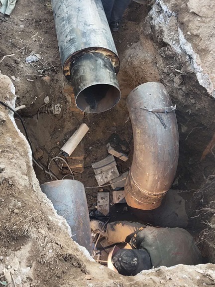 927日,展東路與海拉爾大街十字路口的一次網(wǎng)跑水,開挖后發(fā)現(xiàn)相鄰的排污管道有破損,供熱管道浸泡在污水中,腐蝕嚴(yán)重,需要先處理好污水管道才能搶修熱力管道,增大了施工難度。經(jīng)過(guò)幾次嘗試,最終決定對(duì)漏點(diǎn)處進(jìn)行線位改遷,重新鋪設(shè)管道。經(jīng)過(guò)10天持續(xù)不斷、緊張輪流作業(yè),于106日中午,終于修復(fù)管網(wǎng)漏點(diǎn),保證了管網(wǎng)注水試壓。