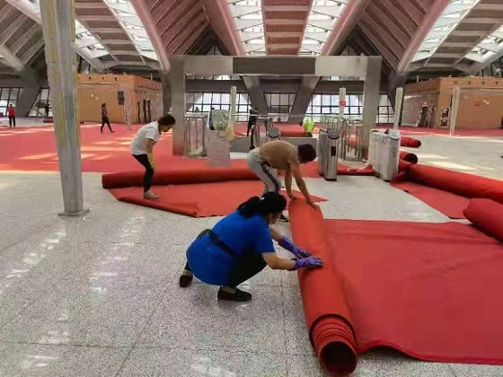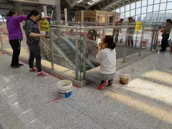 由于東客站長時間閑置導致站內外車道、廣場雜草叢生,站內通道、大廳地面及辦公區域灰塵堆積。由于啟用時間緊、作業面積較大,城發物業公司立即組織人員、機械設備、物料用品,次日一早,工作人員入場保潔,從門前車道、廣場除草、噴藥到建筑外立面玻璃擦拭;從站內地面、辦公區域清潔到客車入站處場地及道路沖洗,隨處都能看到工作人員的身影。原本需要一周的工作,在工作人員的不懈努力下,僅用三天就完成了集團公司安排的保潔工作任務。使保潔面積2.3萬平米的現場面貌煥然一新,具備了投入使用的條件,也體現了物業公司能打硬仗、敢于攻堅的企業精神。