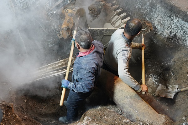 筆者于晚間6:00抵達搶修現(xiàn)場時,大老遠地就看見沿路的井蓋都冒著白色的水蒸氣,進入搶修現(xiàn)場,筆者看到,橋靠分公司總經(jīng)理阮強、副總經(jīng)理張國良、運營四所所長馮俊及公用事業(yè)管理局相關(guān)領(lǐng)導在現(xiàn)場緊鑼密鼓地指揮著搶修?,F(xiàn)場兩個搶修師傅正在一個10平方米、2米多深的大坑中,一鍬一鍬地奮力挖著坑內(nèi)的土,現(xiàn)場工作人員介紹到,因為已經(jīng)接近管道,為確保管道的安全,目前只能人工挖掘。當時的室外溫度在-11℃,工人們卻是滿頭大汗。