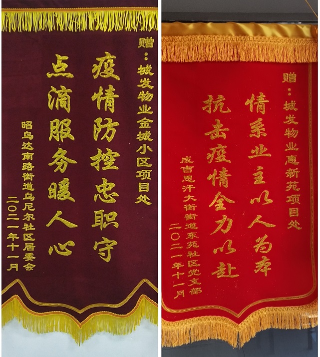 2021年城發物業公司年度取得了可喜成績,2021年被呼和浩特市物業管理協會評為2021年度先進單位、管理的金城小區項目被呼和浩特市物業管理協會評為2021年度呼和浩特市物業管理示范項目,史濤、郝曉東、范宇昆、董美麗四名同志被呼和浩特市物業管理協會評為2021年"抗議勇士"與"最美物業人","金城小區"、"陽光美居"、"惠新苑"項目處分別被賽罕區烏尼爾社區居委會、富力社區、新城區東苑社區居委會贈送"疫情防控忠值守,點滴服務暖人心"錦旗和榮譽證書。