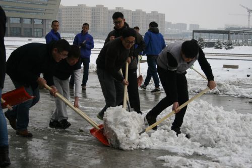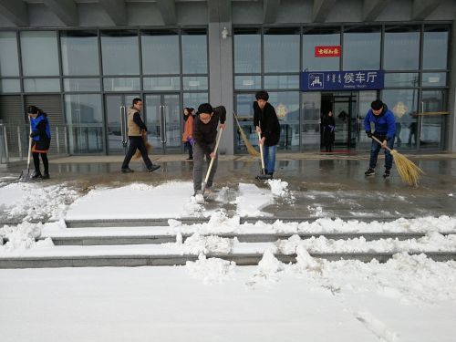 上午九點整,24名青年團員準時在城發客運公司站前廣場集合,對站前廣場上的積雪進行清掃。青年團員們不怕臟,不怕累,經過近一個小時的認真清理,干凈整潔的站前廣場呈現在大家眼前。