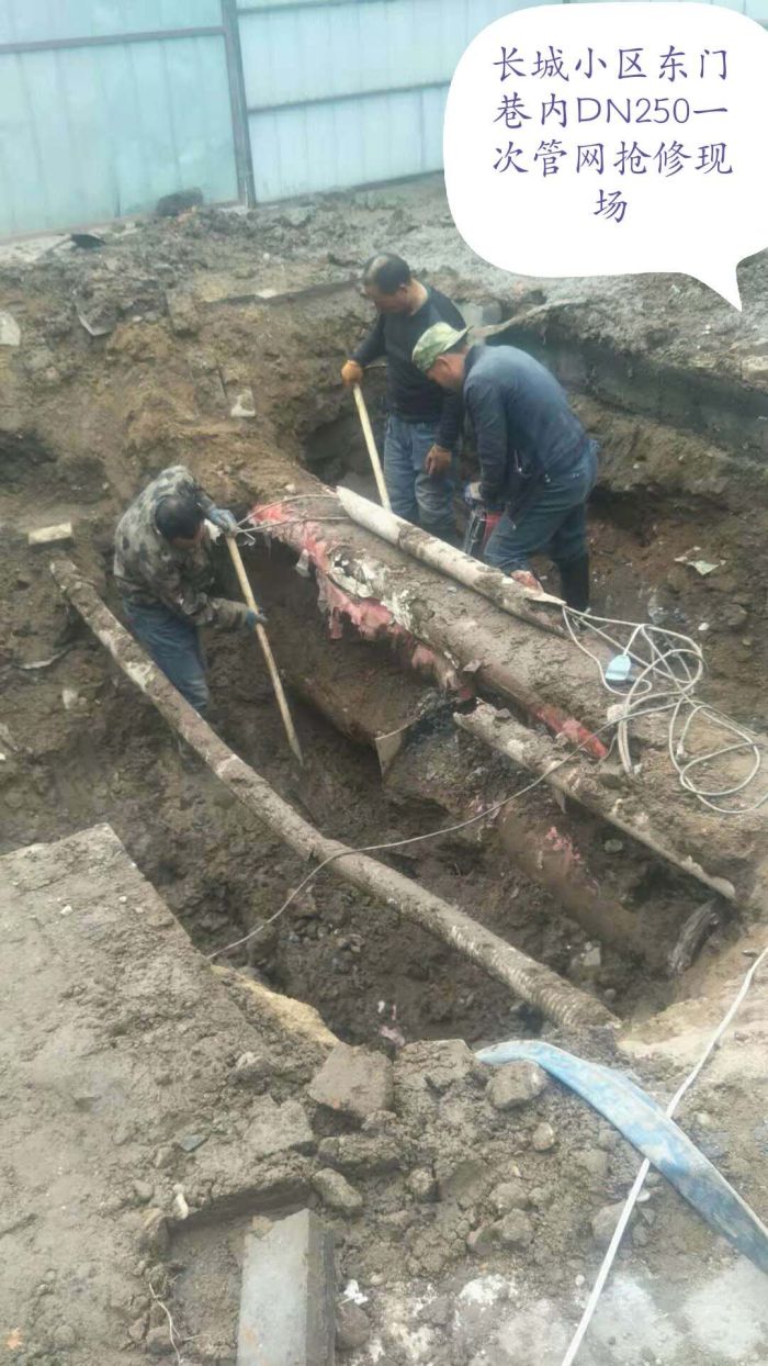 9月29日,管網公司接到辛家營供熱分公司搶修通知,騰飛南路如意廣場環形路口北側東綠化帶中發現一處冒水現象。管網公司領導高度重視,迅即安排人手,查找漏水點。他們憑借豐富的搶修經驗,決定采用十字釘,直架設于涵管之上,創造人工作業通道,根據涵管內水流方向判斷,搶修人員在胸腹部綁上滑板及護具,在DN600熱力管道中向西滑行50米左右,終于發現了漏水點。為了給供暖投運工作贏取時間,參與搶修的20余人輪班作業,連續奮戰7個晝夜,10月6日,圓滿完成搶修任務。