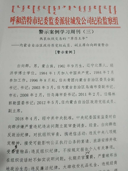 《條例》學習結束后,呂振平同志帶領大家集中學習了警示案例學習周刊三——內蒙古自治區政府原黨組成員、副主席白向群案警示。