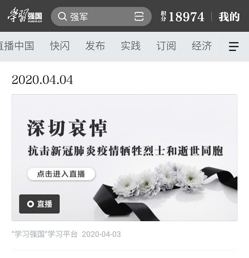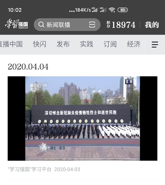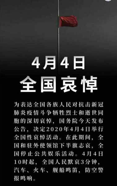 10:00時起,不論是在家中休息還是在工作崗位,全體黨員、預備黨員、積極分子,莊嚴肅立,和全國人民一起為逝去的英雄和同胞默哀三分鐘,向疫情中犧牲的烈士致敬,向災難面的逆行者致敬!向百姓的守護者致敬!