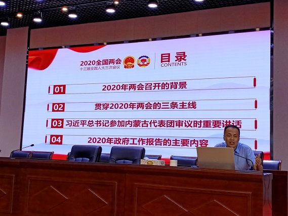 孫忠輝副教授以2020年全國兩會精神為專題,分別對2020年兩會召開的背景、貫穿2020年兩會的三條主線、習近平總書記參加內(nèi)蒙古代表團審議時重要講話、2020年政府工作報告的主要內(nèi)容做了深入的解讀與細致的講解。兩會號召全國各族人民要更加緊密地團結在以習近平同志為核心的黨中央周圍,高舉中國特色社會主義偉大旗幟,以習近平新時代中國特色社會主義思想為指導,全面貫徹黨的十九大和十九屆二中、三中、四中全會精神,堅決貫徹黨的基本理論、基本路線、基本方略,增強“四個意識”、堅定“四個自信”、做到“兩個維護”,緊扣全面建成小康社會目標任務,統(tǒng)籌推進疫情防控和經(jīng)濟社會發(fā)展工作,在疫情防控常態(tài)化前提下,堅持穩(wěn)中求進工作總基調(diào),堅持新發(fā)展理念,堅持以供給側結構性改革為主線,堅持以改革開放為動力推動高質(zhì)量發(fā)展,堅決打好三大攻堅戰(zhàn),加大“六穩(wěn)”工作力度,全面落實“六保”任務,堅定實施擴大內(nèi)需戰(zhàn)略,維護經(jīng)濟發(fā)展和社會穩(wěn)定大局,同心協(xié)力,攻堅克難,銳意進取,確保完成決戰(zhàn)決勝脫貧攻堅目標任務,全面建成小康社會。同時闡明了中華民族向來不畏艱難險阻、當代中國人民有戰(zhàn)勝任何挑戰(zhàn)的堅定意志和能力。