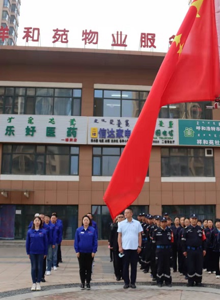 927日上午,城發物業公司黨支部聯合呼市住房保障和房屋管理局經營管理處祥和苑公租房管理站在祥和苑公租房小區舉行“我和我的祖國——升國旗、唱國歌”獻禮中華人民共和國成立72周年活動。黨員、干部、職工共40余人參加此次活動。